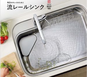 流レールシンクお料理中などに使う水が、ゴミや汚れを手前の「流レール」に集めながら流れます。「流レール」に入ったゴミは水に流水に押されて排水口に集まる仕組みです。