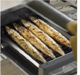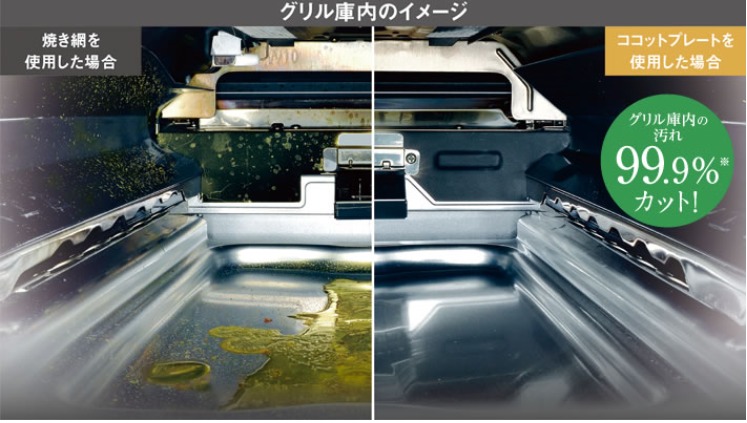 お手入れかんたんグリルグリルから取り出しやすく、洗いやすい「フラット焼き網」「汚れカバー」「クリアコートグリル皿」を採用。